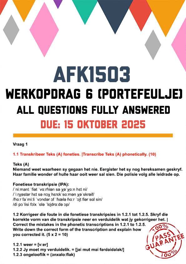 AFK1503 Werkopdrag 6 (Portefeulje) Memo | Due 15 Oktober 2025. All questions fully answered.