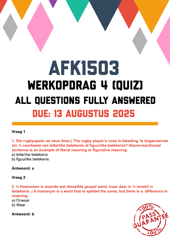 AFK1503 Werkopdrag 4 (Quiz) Memo | Due 13 Augustus 2025. 100% All correct answers shown.