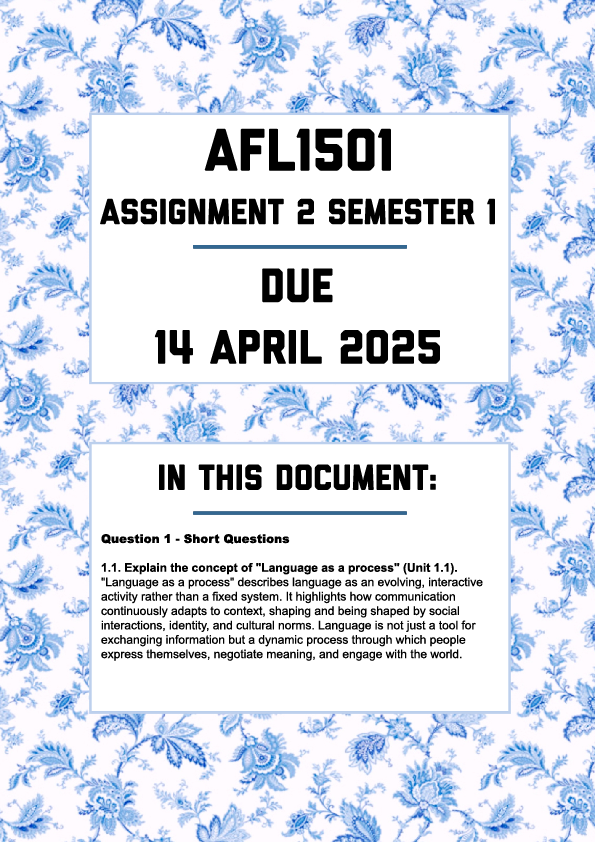 AFL1501 ASSIGNMENT 2 SEMESTER 1 MEMO 2025. DUE 14 APRIL 2025. 100% ALL QUESTIONS FULLY ANSWERED WITH 3 ESSAYS PROVIDED FOR QUESTION 3.