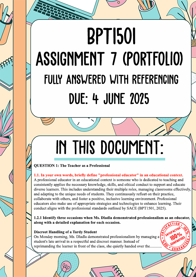 BPT1501 Assignment 7 (Portfolio) Semester 1 Memo | Due 4 June 2025. All questions fully answered. QUESTION 1: The Teacher as a Professional Examine the scenario below and respond to the subsequent questions. Ms. Dladla is in her fifth year of teaching at Riverside High. During a particularly challenging week, she demonstrated both commendable and questionable conduct in various situations. A student’s late arrival to class disrupted the lesson on Monday morning. Ms. Dladla discreetly gave the tardy student the worksheet and quietly explained the instructions, avoiding any public attention to their lateness. Following class, she had a private conversation with the student to explore any issues contributing to their lateness. That afternoon, Ms. Dladla snapped at her students for talking during a test. Slamming her book down, she yelled,