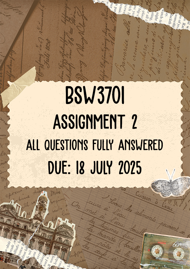 BSW3701 Assignment 2 Memo | Due 18 July 2025. This document contains a fully answered assignment with complete answers to all questions and tasks. Every section is carefully completed to ensure a guaranteed pass. Perfect for guaranteed pass, high marks, and peace of mind.