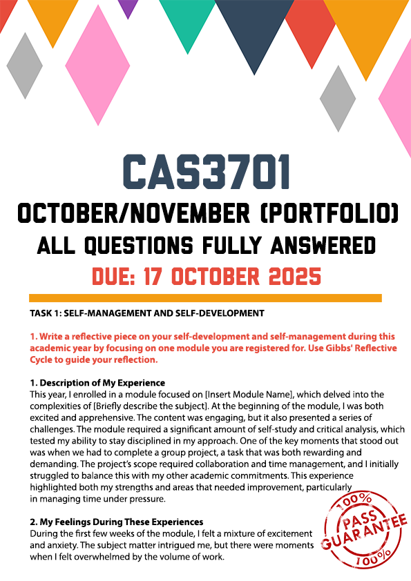 CAS3701 October/November (Portfolio) Memo | Due 17 October 2025. All questions fully answered. TASK 1: SELF-MANAGEMENT AND SELF-DEVELOPMENT. Write a reflective piece on your self-development and self-management during this academic year by