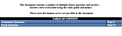 A document containing over 150 Multiple Choice Question & Answers for CIC2601. The answers were checked using Memo’s and feedback provided by UNISA, so you are guaranteed a passing grade with these answers.