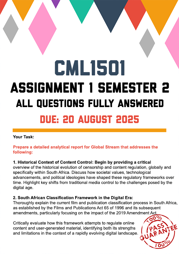 CML1501 Assignment 1 Semester 2 Memo | Due 20 August 2025. All questions fully answered. You are a legal advisor to “Global Stream,” a new international digital content