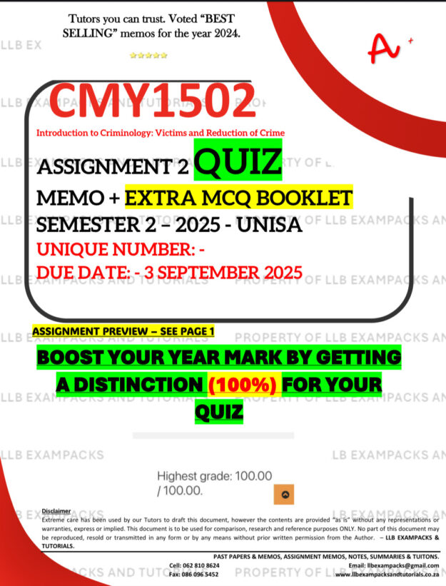 CMY1502 ASSIGNMENT 2 QUIZ MEMO – SEMESTER 2 – 2025 – UNISA – DUE DATE: – 3 SEPTEMBER 2025 (QUIZ ANSWERS – DISTINCTION GUARANTEED!) INCLUDES FREE MCQ BOOKLET