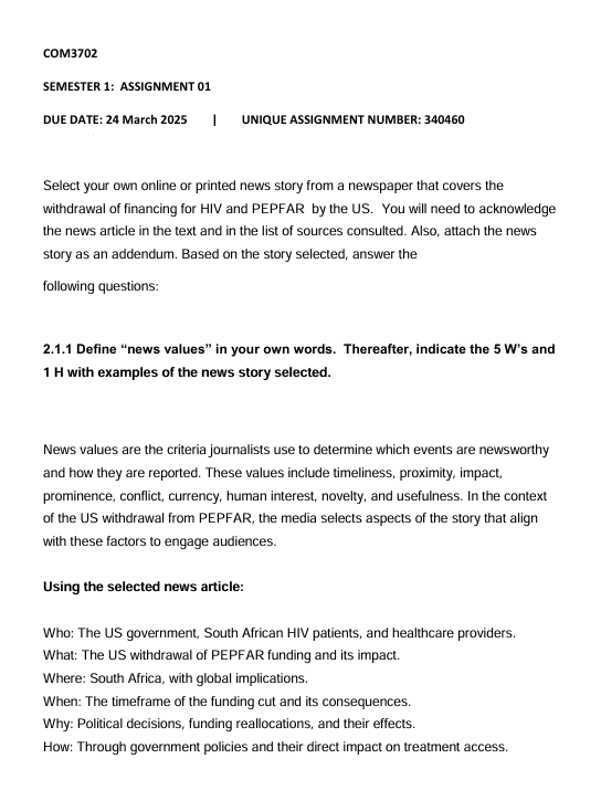 Select your own online or printed news story from a newspaper that covers the withdrawal of financing for HIV and PEPFAR by the US. You will need to acknowledge the news article in the text and in the list of sources consulted. Also, attach the news story as an addendum. Based on the story selected, answer the following questions: