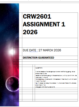 CRW2601 ASSIGNMENT 1 2026 | DUE 27 MARCH 2026 – DISTINCTION GUARANTEED. QUESTION X is the leader of a dangerous human trafficking gang. He is afraid that Z, the leader of another gang in the same town, will try to kill him. He instructs Y, who is his neighbour, to shoot Z. X threatens Y that he (X) will kill both Y and Y’s wife if he (Y) does not obey X’s orders. Y, who is terrified of X, shoots and kills Z. Y is charged with the murder of Z. (SG 6, pp. 84, 87-88). I will invoke the ground of justification known as necessity (or compulsion) to ensure a complete acquittal for Y on the charge of murder.