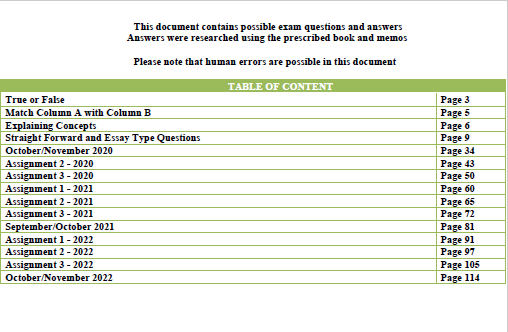 A document containing possible exam questions and answers for CUS3701. Answers were researched using memo’s and feedback from UNISA, so you are guaranteed a passing grade. This document is efficient for online examination and for a quick study session.