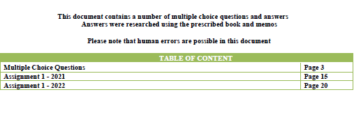 A document containing a number of Multiple Choice Question & Answers for CUS3701. The answers were checked using Memo’s and feedback provided by UNISA, so you are guaranteed a passing grade with these answers.
