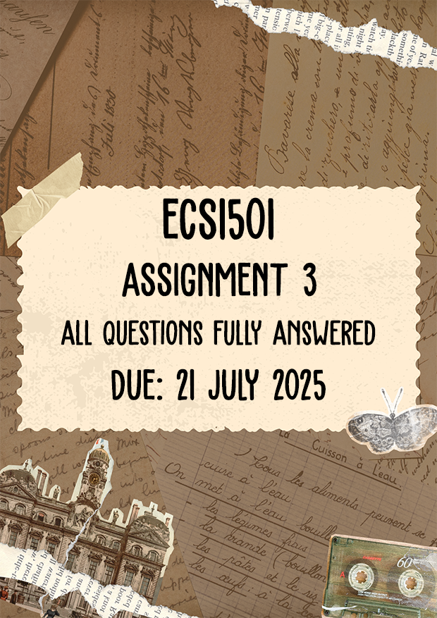 ECS1501 Assignment 3 Memo | Due 21 July 2025. This document contains a fully answered assignment with complete answers to all questions and tasks. Every section is carefully completed to ensure a guaranteed pass. Perfect for guaranteed pass, high marks, and peace of mind.
