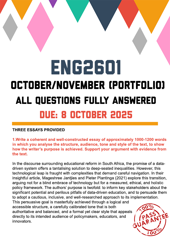 ENG2601 October/November (Portfolio) Memo | Due 8 October 2025. THREE ESSAYS PROVIDED. 1. Write a coherent and well-constructed essay of approximately 1000-1200 words in which you