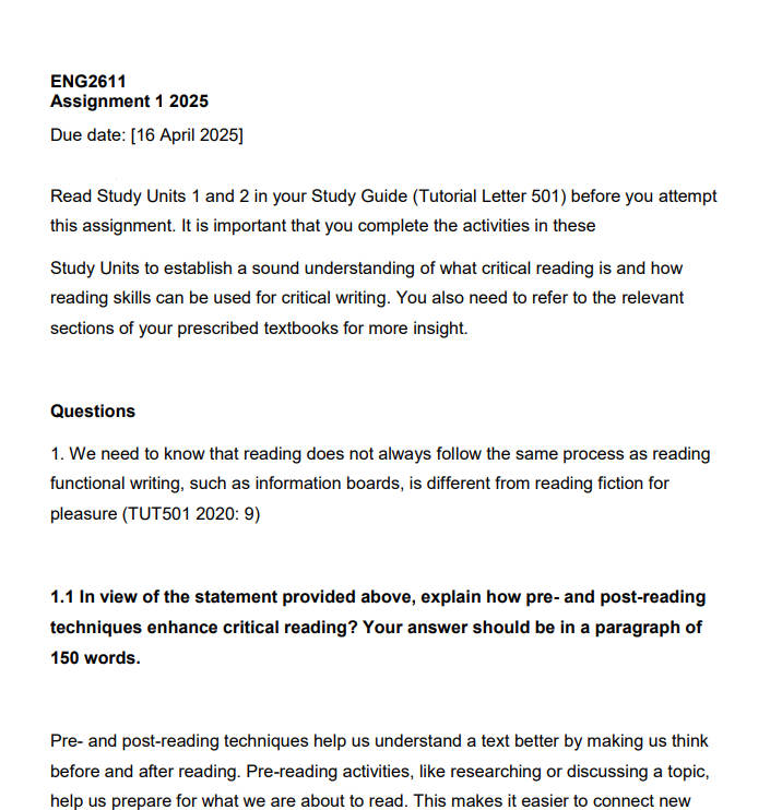 1.1 In view of the statement provided above, explain how pre- and post-reading techniques enhance critical reading? Your answer should be in a paragraph of 150 words.
