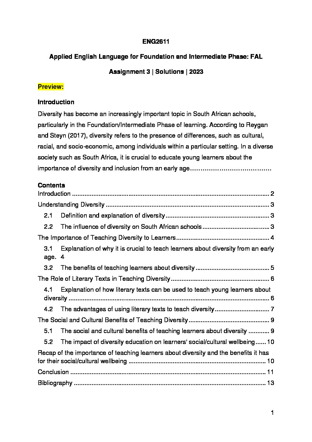 This essay provides a thorough exploration of the importance of teaching learners about diversity in the South African context. It covers a wide range of topics including a detailed explanation of what diversity is, its influence on South African schools, the significance of teaching learners about diversity from an early age, how literary texts can be effectively used as a resource to teach about diversity and the social and cultural benefits of diversity education. The essay includes a critical analysis of the sources to support the argument and provide insights into the current understanding of diversity education in South Africa.