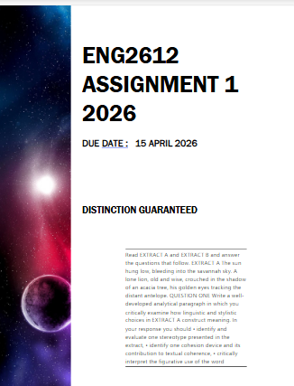 ENG2612 Assignment 1 Semester 1 2026 | Due 15 April 2026 – Distinction Guaranteed.  Read EXTRACT A and EXTRACT B and answer the questions that follow. EXTRACT A The sun hung low, bleeding into the savannah sky. A lone lion, old and wise, crouched in the shadow of an acacia tree, his golden eyes tracking the distant antelope. QUESTION ONE Write a well-developed analytical paragraph in which you critically examine how linguistic and stylistic choices in EXTRACT A construct meaning. In your response you should • identify and evaluate one stereotype presented in the extract, • identify one cohesion device and its contribution to textual coherence, • critically interpret the figurative use of the word “hunting”, paying attention to its symbolic and thematic significance. Your paragraph should integrate relevant linguistic terminology. 10 marks Read EXTRACT B and answer the question that follows EXTRACT B Belong We all want a place where we can belong, Where we can dance to our tune and sing our song. We want to be known, we want to be felt, And when they feel us, we want them to melt. QUESTION TWO In not more than 150 words, discuss how the writers in both EXTRACTS A and B use literary and linguistic devices to reflect the relationship between humans and their environment. 10 marks