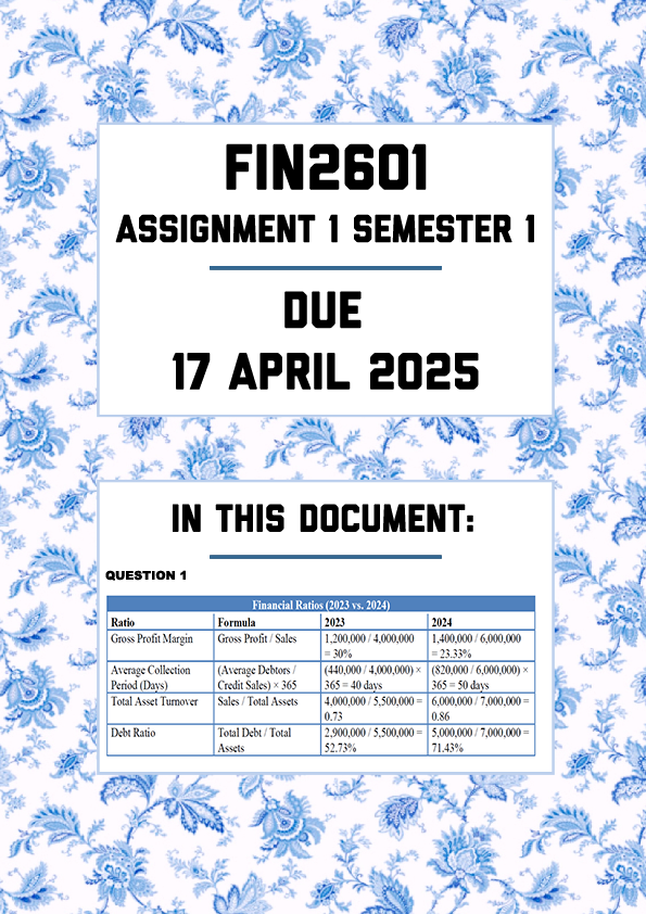 FIN2601 Assignment 1 Semester 1 Memo | Due 17 April 2025. All questions answered.