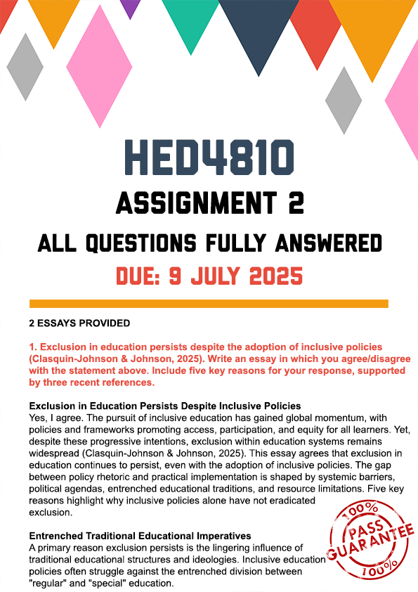 HED4810 Assignment 2 Memo | Due 9 July 2025. 2 Essays Provided. This document contains a fully answered assignment with complete answers to all questions and tasks. Every section is carefully completed to ensure a guaranteed pass. Perfect for guaranteed pass, high marks, and peace of mind.