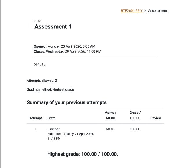 BTE2601 Assignment 1 QUIZ 2026 – Due 29 April 2026 (DISTINCTION OBTAINED 100%)