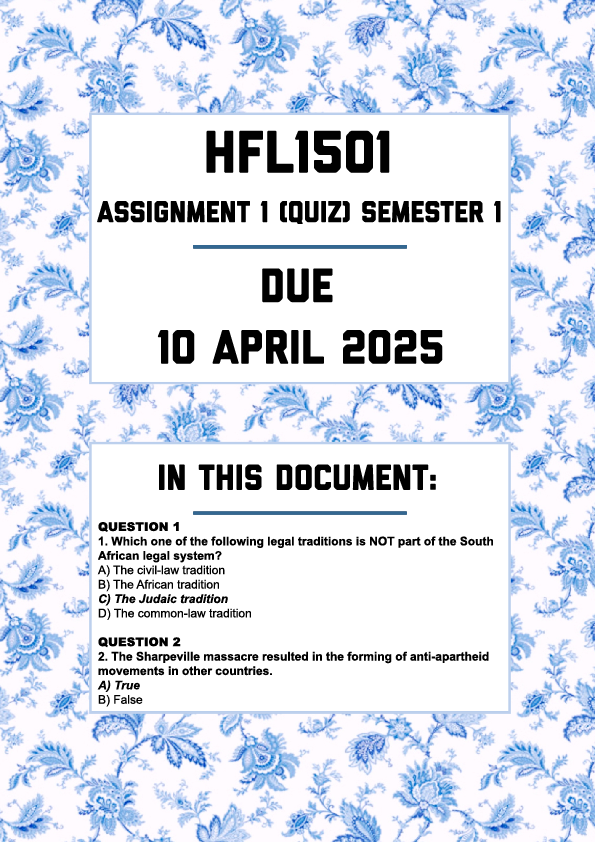 HFL1501 Assignment 1 (Quiz) Semester 1 Memo | Due 10 April 2025. 100% All correct answers. Guaranteed A+.