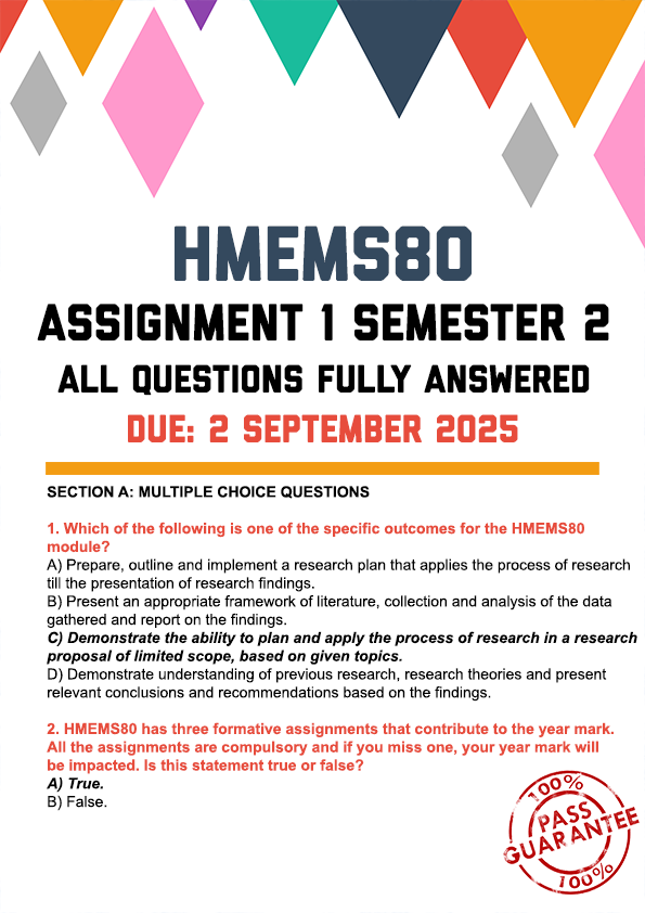 HMEMS80 Assignment 1 Semester 2 Memo | Due 2 September 2025. All questions fully answered. Question 1: Which of the following is one of the specific outcomes for the HMEMS80 module?