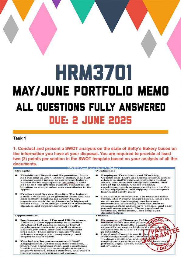 HRM3701 May/June Portfolio Memo | Due 2 June 2025. All questions fully answered. Read the case study below and complete the tasks that follow: You work at a HR consultancy firm. Mr. Mudau, a senior consultant in your firm recently passed away. Your supervisor (Ms. Ismail) handed you the last client file (Betty’s Bakery – pages 6 to 13 of this document) that Mr Mudau was working on before his demise. She requests you to work through the file and submit a proposal on how to manage issues at Betty’s Bakery as soon as you can. She understands that this may be your first task handling such a big project, so she guides you by providing you with specific tasks to work on. These are indicated below. Task 1: You need to peruse through the case file (pages 6 – 13 of this document) that Mr Mudau has compiled. In order to wrap your head around the case, you decide to work meticulously through all the documents. The case file includes (1) company background information, (2) a copy of the employment contract between Betty’s Bakery and their employees, (3) an interview transcript between Mr Mudau and a waitron from Betty’s Bakery and (4) some of Mr Mudau’s notes. Conduct and present a SWOT analysis on the state of Betty’s Bakery based on the information you have at your disposal. You are required to provide at least two (2) points per section in the SWOT template based on your analysis of all the documents. [9] Task 2: The staff at Betty’s Bakery have never had a formal contract of employment. In trying to correct matters, Betty quickly draws up an employment contract on Chat GPT for a waitron. You peruse the contract and notice many issues. You set out to correct these issues and create a new and improved employment contract for Betty’s Bakery. 2.1 Your task is to critically evaluate the employment contract extract provided, identifying at least five instances of non-compliance with South African labour legislation. (5) 2.2 For each issue identified in 2.1, analyse the implications of the non-compliance for both the employer and the employee by interpreting and applying the relevant provisions of South African labour law. Make sure to indicate the relevant excerpt from the Act/Law. (5) 2.3 Synthesize a legally compliant and practically effective revision of each clause. (20) [30] Task 3: 3.1 Staff complained that they have not been receiving payslips. They explain to you that monthly salary deductions are made for late coming, negligence, breakages and theft without any records, evidence or explanations. Compile a compensation policy for Betty’s Bakery which clearly states employees’ salaries, any additional compensation and deductions that are made. (10) 3.2 Based on the policy you have created in question 3.1, compile a dummy payslip to show Betty exactly what needs to be included. The employee for whom you will be compiling the dummy slip will work 1 hour overtime on one Sunday in the month. (10) [20] Task 4: Betty’s Bakery is getting a lot of negative PR on social media. Instruct Betty on how to respond to any negative posts made on social media. Provide her with a general response on how she can address the negative image that has now been created of the company. [5] Task 5: Complete the self-reflective learning journal as per the instructions provided. [35] Task 6: Provide a bibliography for all sources you have used in this assessment as per the Harvard Referencing style. [1] Total: 100 marks
