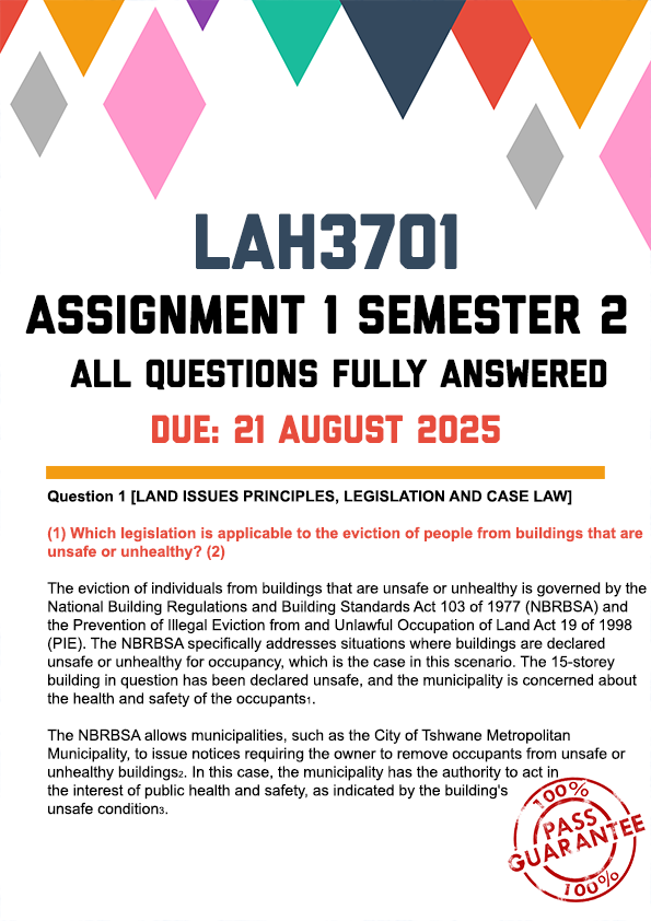 LAH3701 Assignment 1 Semester 2 Memo | Due 21 August 2025. All questions fully answered. Question 1 [LAND ISSUES PRINCIPLES, LEGISLATION AND CASE LAW]