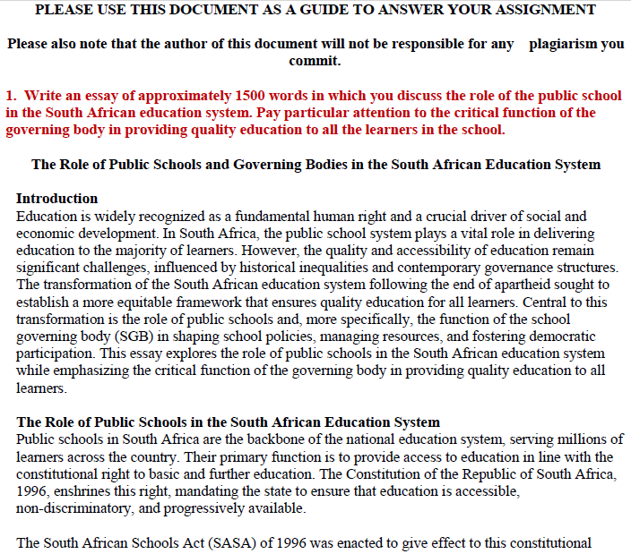 LCP4809 Assignment 1 Semester 1 | Due 17 March 2025. TWO ESSAYS PROVIDED. Write an essay of approximately 1500 words in which you discuss the role of the public school in the South African education system. Pay particular attention to the critical function of the governing body in providing quality education to all the learners in the school.