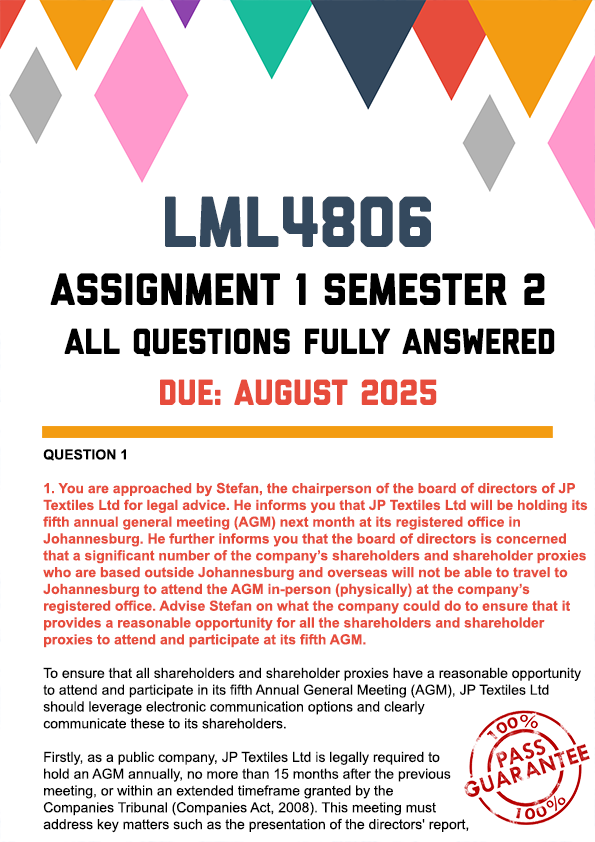 1. You are approached by Stefan, the chairperson of the board of directors of JP Textiles Ltd for legal advice. He informs you that JP Textiles Ltd will be holding its fifth annual general meeting (AGM) next month at its registered office in Johannesburg. He further informs you …
