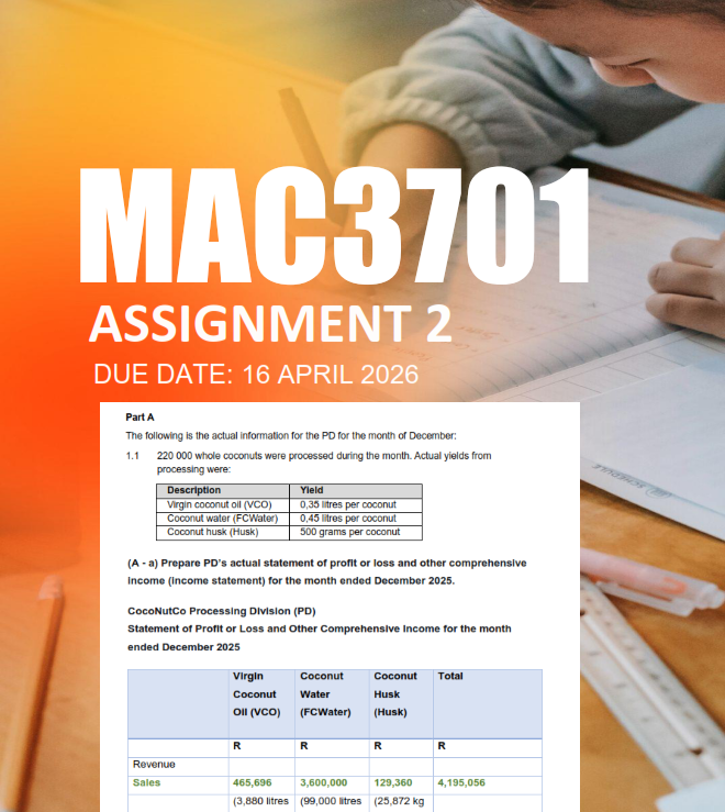 Part A (28 Marks; 50 Minutes) The following is the actual information for the PD for the month of December: 1.1 220 000 whole coconuts were processed during the month. Actual yields from processing were: Description Yield Virgin coconut oil (VCO) 0,35 litres per coconut Coconut water (FCWater) 0,45 litres per coconut Coconut husk (Husk) 500 grams per coconut 1.2 Raw coconuts were purchased at R18 per coconut. 1.3 Processing is performed in batches of 500 coconuts per batch. 1.4 Variable manufacturing overheads (VMO) were R440 per batch. 1.5 The standard labour clock rate was R90 per work hour, and it takes 12 clock minutes to process one coconut. CNC allows for a 10% idle time. 1.6 Fixed manufacturing overheads (FMO) for the month amounted to R150 000, which was initially budgeted for at R120 000 for the same level of production. 1.7 Coconut water is further purified and pasteurised to improve its taste, clarity, and shelflife at a cost of R12 000 per Kilolitre (KL). The further-processed coconut water is sold for R70 a litre.