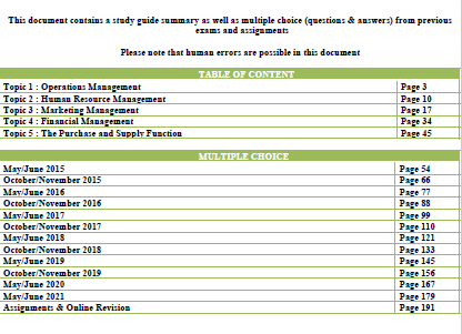 This document contains questions and answers from previous exams/assignments. Answers were researched using the study guide and memos as well as a summary of the study guide. The notes are simple and easy to understand and will be a huge help in ensuring you pass this module with ease.