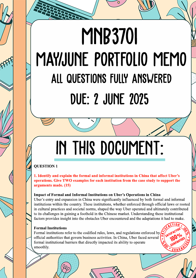 MNB3701 May/June Portfolio Memo | Due 2 June 2025. All questions fully answered. Question 1 Identify and explain the formal and informal institutions in China that affect Uber’s operations. Give TWO examples for each institution from the case study to support the arguments made. (15) Question 2 Apply the national competitive advantage theory to the case. Provide FIVE examples from the case study. (10) Question 3 Evaluate the advantages that China has to offer Uber in its investments in China. Give FOUR examples for each type of advantage from the case study to support the arguments made. (10) Question 4 Discuss the potential benefits for China as a host country from Uber’s foreign investment. Give one example for each benefit from the case study to support your argument. (10) Question 5 Analyse how cultural dimensions outlined by Hofstede’s framework might affect the management of Uber in China by making comparisons between the USA and China. (10) Question 6 Evaluate how the environmental challenges faced by China affect Uber’s operations. (5) Question 7 Appraise Uber’s key resources and capabilities using the value, rarity, imitability and organisation (VRIO) framework. (10) Question 8 In your opinion, did Uber make the right decision to exit the Chinese market, or should it have continued? Substantiate your answer by FIVE key points. (5) Question 9 Investigate the disruption that Uber caused when they entered the South African market. In your answer, you should (i) address consumer and competitor dimensions of the taxi industry by comparing traditional metered South African taxis and Uber taxis. (8) (ii) explain the disruption caused by Uber on the traditional taxi industry. (4) (iii) explain the impact of Uber on the South African economy; the legal environment; the social environment; and other sectors of the economy. (8) 14 Section total: 95 marks Reflections This section focusses on reflections, which gives you an opportunity to critically evaluate your learning journey throughout the module. It is meant to help you consolidate your understanding of global business management principles. Reflect on what you have learnt, the challenges you faced and the skills you gained. (5)