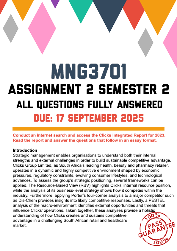 MNG3701 Assignment 2 Semester 2 Memo | Due 17 September 2025. All questions fully answered. Conduct an internet search and access the Clicks Integrated Report for 2023. Read the