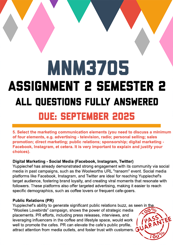 MNM3705 Assignment 2 Semester 2 Memo | Due September 2025. All questions fully answered. Yuppiechef Coffee Cafes,5. Select the marketing communication elements (you need to discuss a minimum of four elements, e.g. advertising – television, radio; personal selling; sales promotion; direct marketing; public relations; sponsorship; digital marketing – Facebook, lnstagram, et cetera. It is very important to explain and justify your choices).