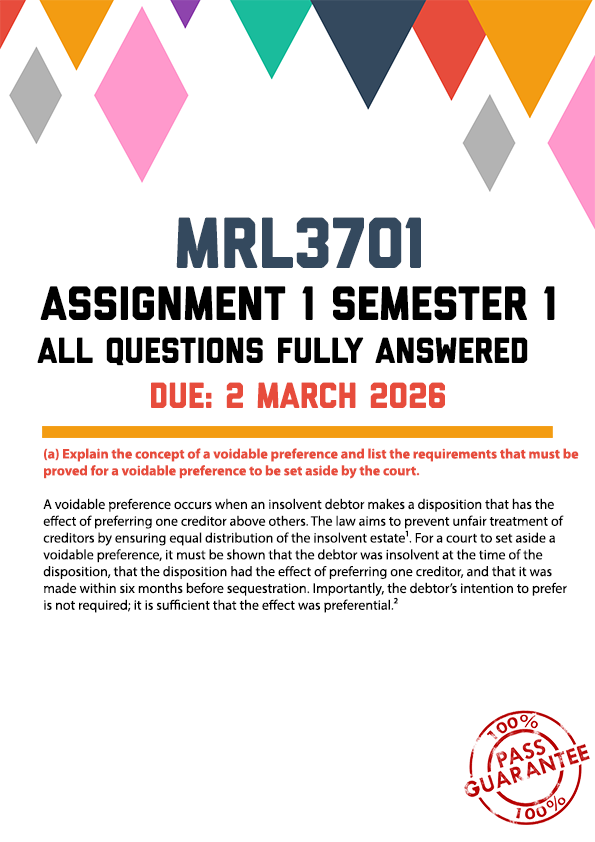 MRL3701 Assignment 1 Semester 1 Memo | Due 2 March 2026. All questions fully answered. Palesa and her best friend Mpho started a new restaurant business in 2023. Despite their impressive culinary skills, the restaurant was not a success. Palesa lost a lot of money which she had invested in the restaurant, leaving her in a dire financial situation. By 1 October 2025, Palesa’s liabilities exceeded her assets by R1,8 million. Palesa presently owes a total of R2,4 million to various creditors. Her creditors include Lethabo to whom she owes R1,1 million.