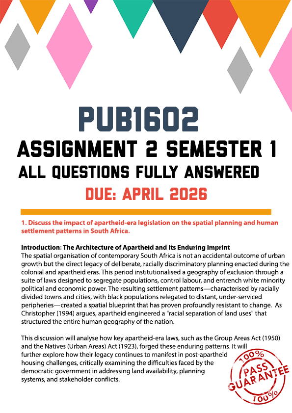 PUB1602 Assignment 2 Semester 1 Memo | Due April 2026. All questions fully answered. 1. Discuss the impact of apartheid-era legislation on the spatial planning and human settlement