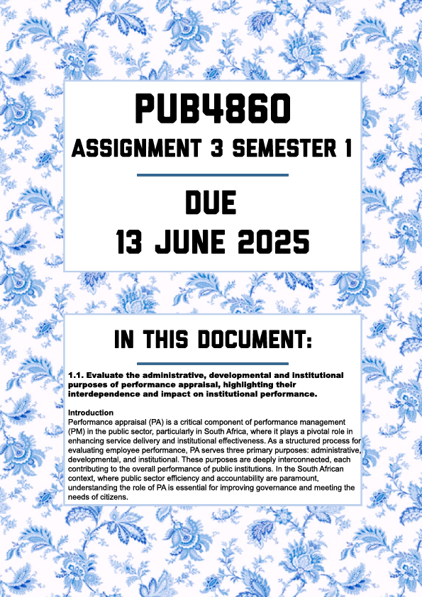 PUB4860 Assignment 3 Semester 1 | Due 13 June 2025. All questions answered. QUESTION Analyse the role of performance appraisal as an integral part of performance management in the public sector, with a specific focus on the South African context. Your response should: 1. Evaluate the administrative, developmental and institutional purposes of performance appraisal, highlighting their interdependence and impact on institutional performance. 2. Provide specific examples from the South African public sector to illustrate how performance appraisals contribute to improved institutional performance while addressing challenges in their implementation.