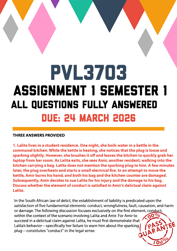 PVL3703 Assignment 1 Semester 1 Memo | Due 24 March 2026. THREE ANSWERS PROVIDED. 1. Lalita lives in a student residence. One night, she boils water in a kettle in the communal