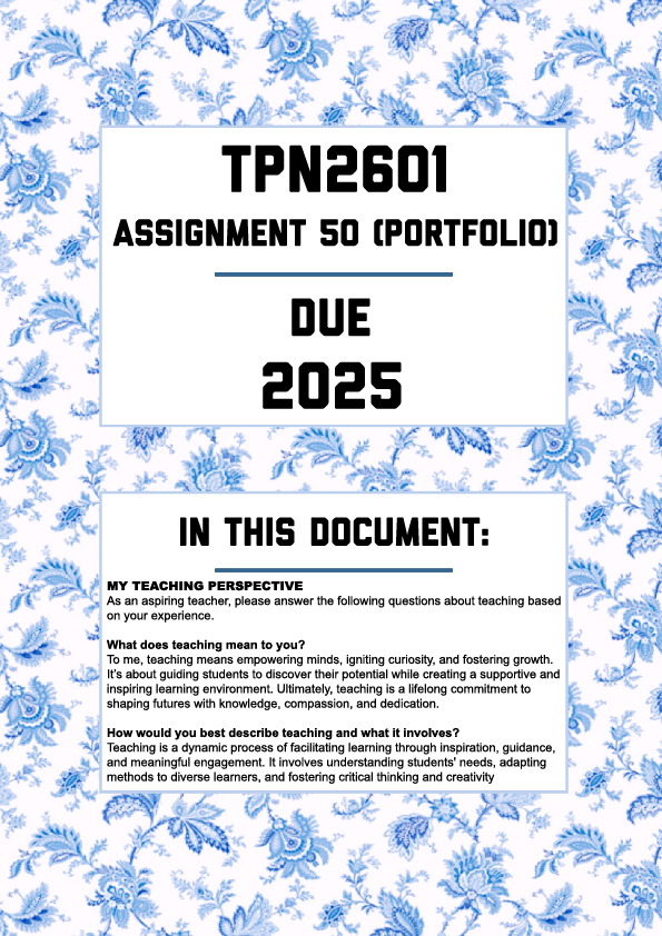 TPN2601 Assignment 50 (Portfolio) Memo | Due 2025. All questions fully answered. 3.2 MY TEACHING PERSPECTIVE, 3.3 STAGES OF A LESSON, LESSON PLAN, 3.4 LESSON OBSERVATIONS, 5 MENTOR REPORT, 6. STUDENT REPORT, 7 BIBLIOGRAPHY/REFERENCES