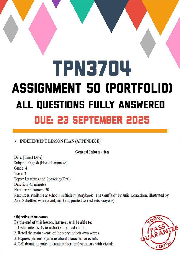 TPN3704 Assignment 50 (Portfolio) Memo | Due 23 September 2025. All questions fully answered. INDEPENDENT LESSON PLAN (APPENDIX E), THE INTEGRATION OF INFORMATION COMMUNICATION TECHNOLOGY (ICT) IN TEACHING, RECORD OF DAILY LESSONS TAUGHT, LESSON PLAN FOR HOME OR FIRST ADDITIONAL LANGUAGE, REFLECTIVE SELF-ASSESSMENT, LESSON PLAN FOR ANY FIRST CHOSEN SCHOOL SUBJECT BUT NOT LANGUAGE, LESSON PLAN FOR ANY SECOND CHOSEN SCHOOL SUBJECT BUT NOT LANGUAGE, SCHOOL ACTIVITIES OBSERVATION AND REFLECTION, CLASSROOM-BASED RESEARCH PROJECT, References