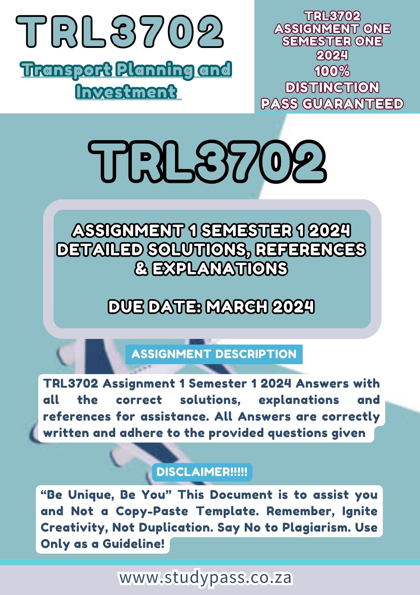 This Document contains answers for TRL3702 Assignment 01 Semester 01 2024. The document includes Answers for Questions One to Two as provided in your assignment booklet / 2024 Tutorial letter. All Answers are correctly written, thoroughly explained in detail and are to be used as GUIDELINES. Copying is strictly forbidden..