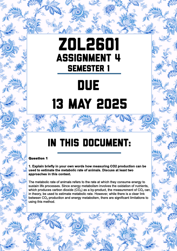 ZOL2601 Assignment 4 Semester 1 Memo | Due 13 May 2025. All questions fully answered. Answer all five questions (total of 50 marks)